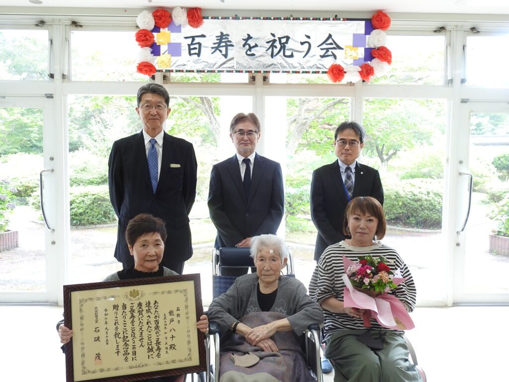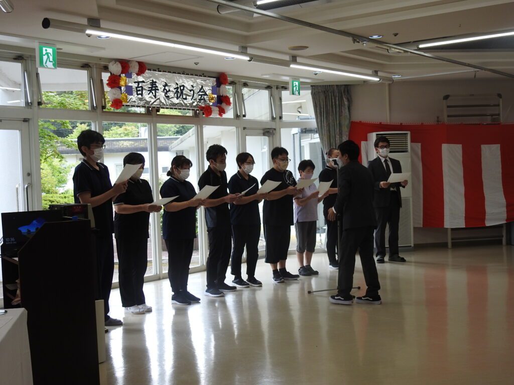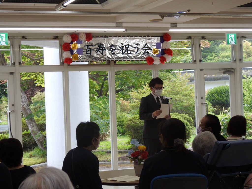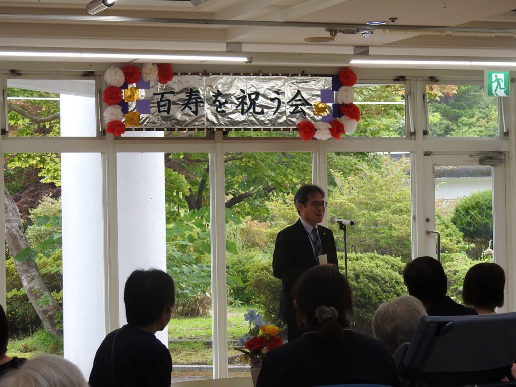 みなみかやべ荘では今年度で100歳を迎える入所者さんが4名いらっしゃいます。昭和61年に当施設が開設されてからはじめての出来事で、入所者さんの健康と長寿をお祝いする記念行事といたしまして、令和7年10月1日に百寿を祝う会及び敬老祝賀会を催しました。