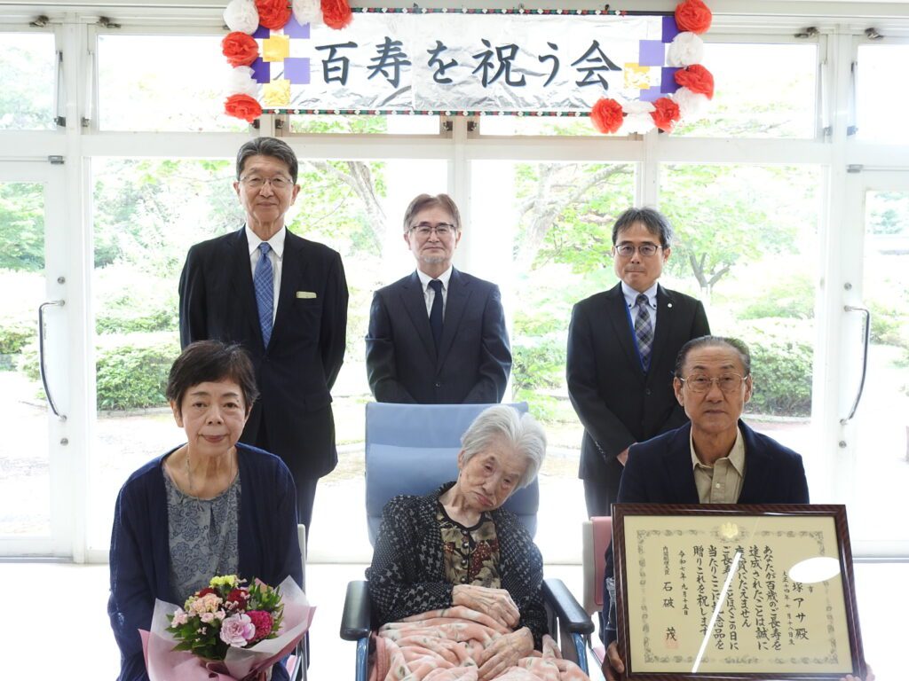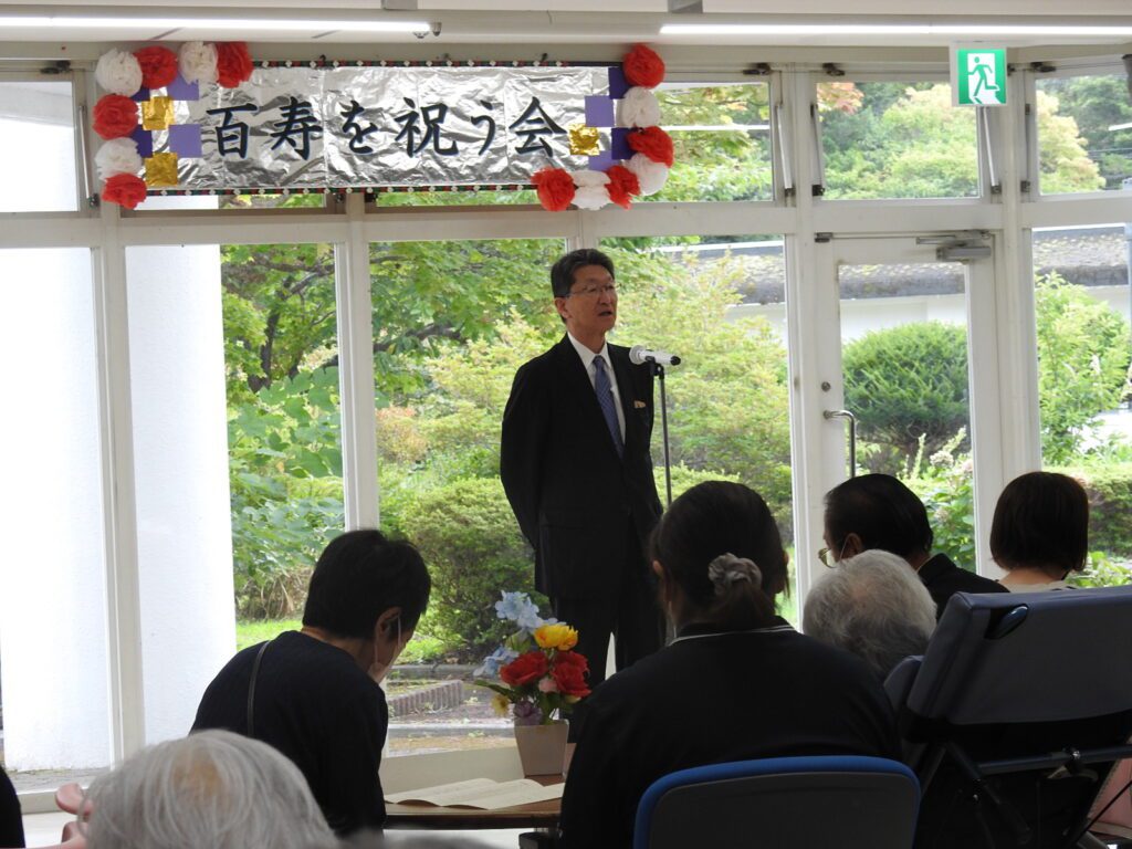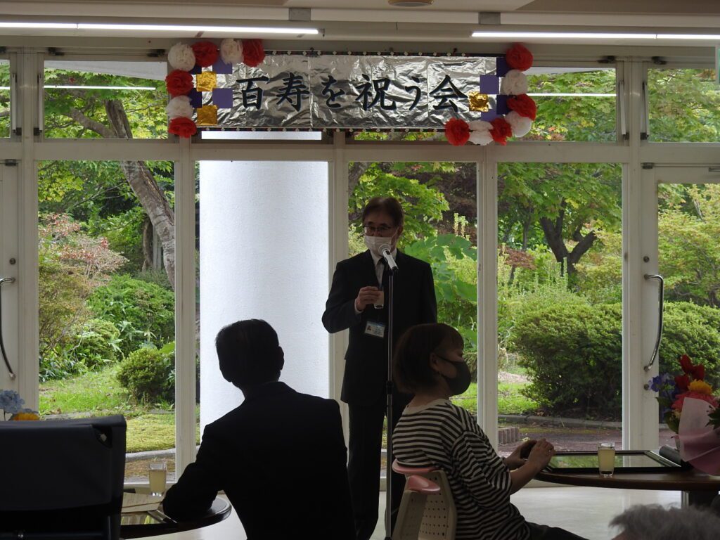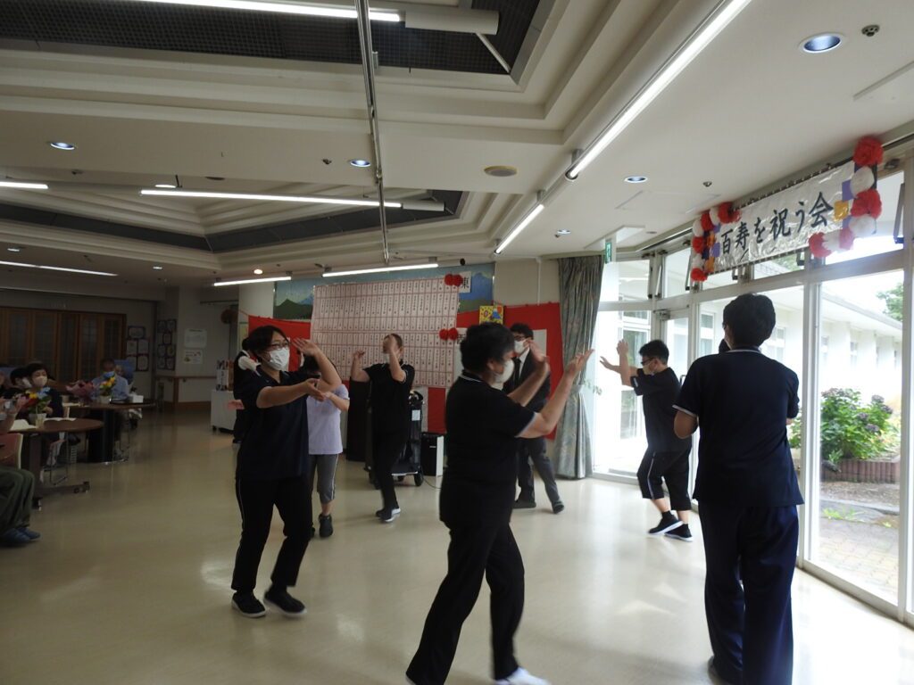 みなみかやべ荘では今年度で100歳を迎える入所者さんが4名いらっしゃいます。昭和61年に当施設が開設されてからはじめての出来事で、入所者さんの健康と長寿をお祝いする記念行事といたしまして、令和7年10月1日に百寿を祝う会及び敬老祝賀会を催しました。