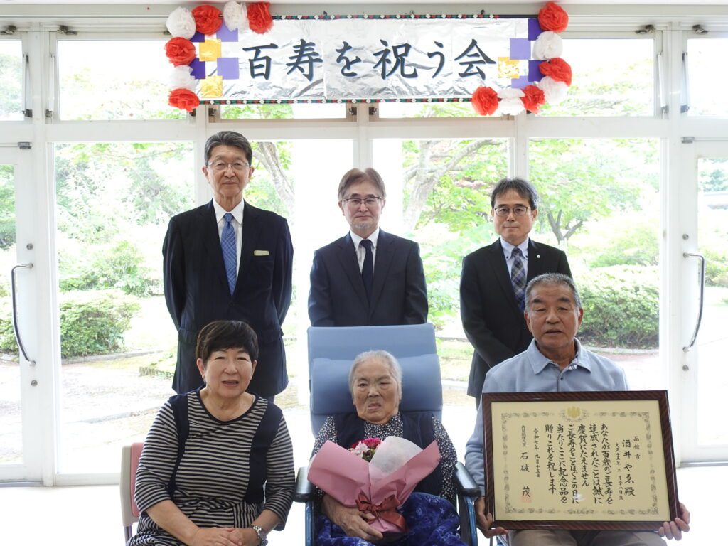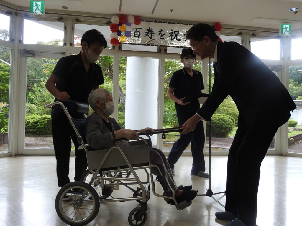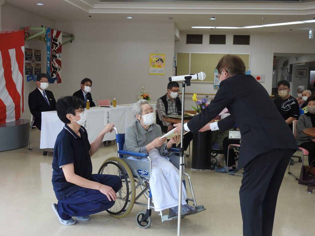 ⑤内閣総理大臣百歳祝い状及び記念品贈呈 函館共愛会理事長 種田貴司より 百寿入所者様へ