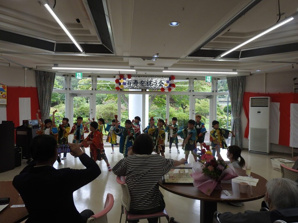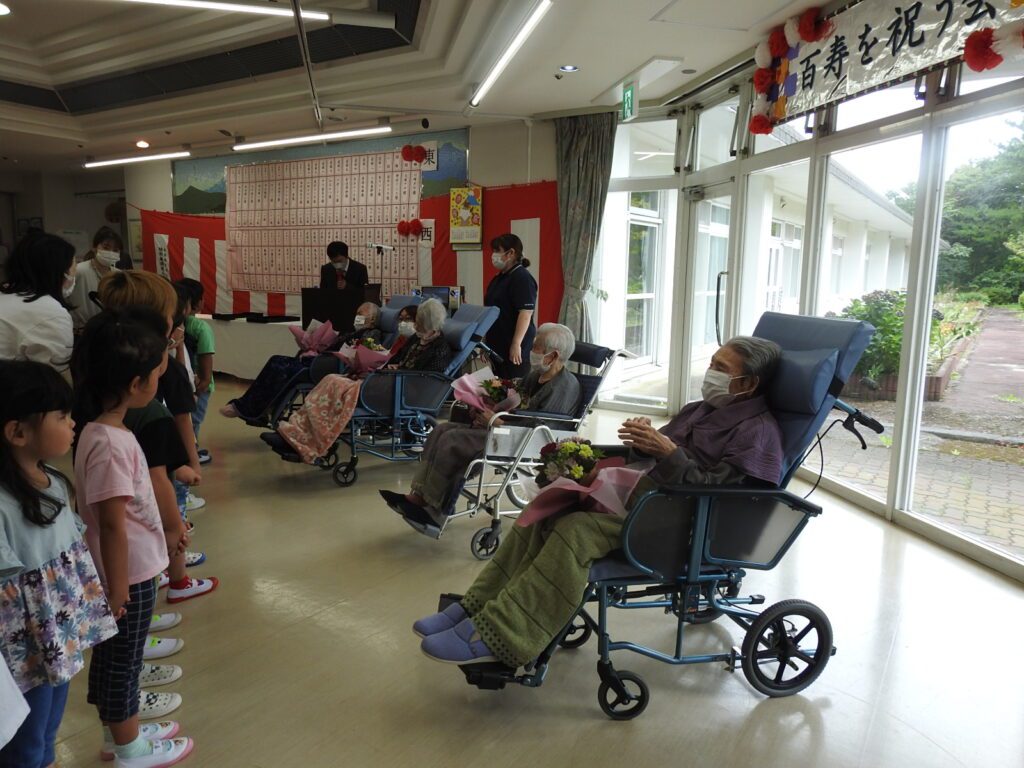 ⑥みなみかやべ荘百寿記念品贈呈 南かやべ認定こども園園児の皆さまより 百寿入所者様へ