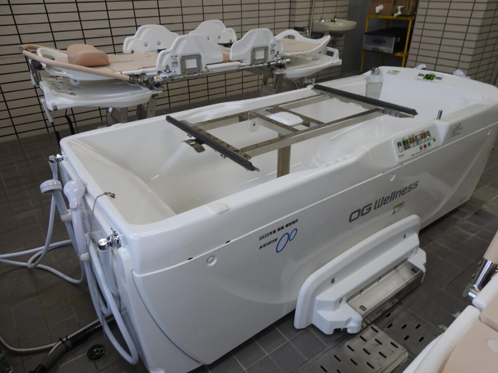 この度、公益財団法人JKA 自転車等機械振興補助事業を活用し、最新式の特殊浴槽を導入しました。この特殊浴槽は、今まで以上に安全で衛生的な入浴が可能となり、また介助者側にも嬉しい様々な機能を有するため、介護職員の負担軽減にも繋がります。