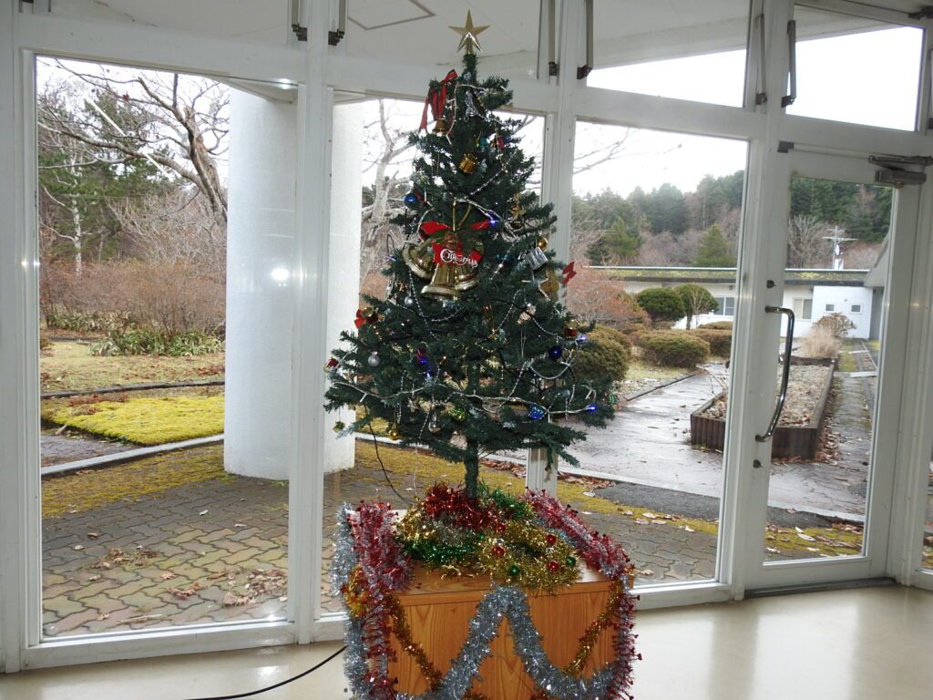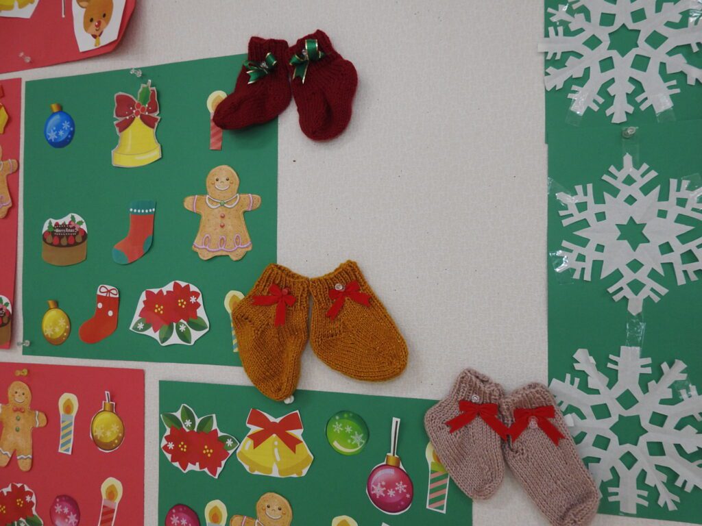 入所者さんと職員が手作りしたクリスマスの飾り付け。毛糸で編んだかわいい靴下が華を添えています。