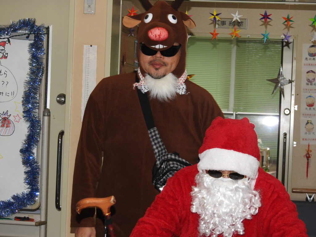 サングラスをかけたファンキーなトナカイとサンタさんが、遠い街アメリカニューヨーク(?)からみなみかやべ荘デイサービスへ来てくれました。