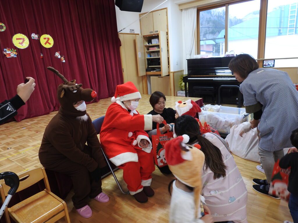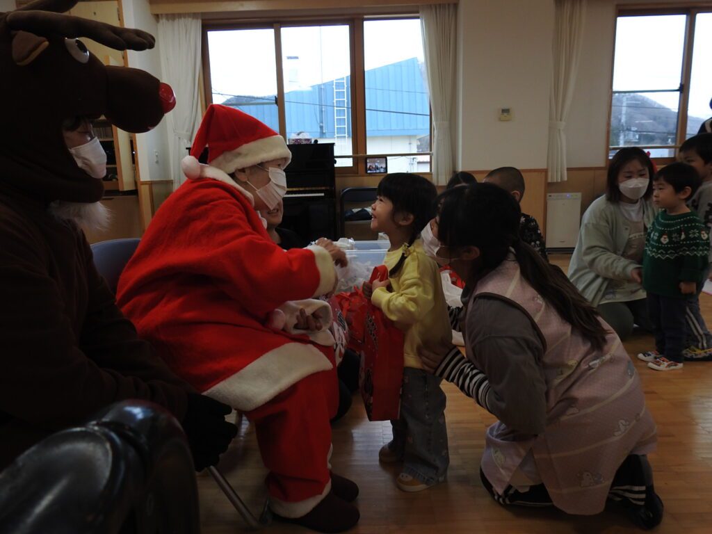 今回の訪問では、入所者の坂本さんがサンタクロース、職員の高谷がトナカイに扮し、園児一人ひとりにクリスマスプレゼントを手渡しました。赤い衣装に身を包んだサンタさんの登場に、園児たちは大喜び。「サンタさんだ!」「ありがとう!」と元気な声が飛び交い、会場はたちまち笑顔に包まれました。
